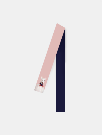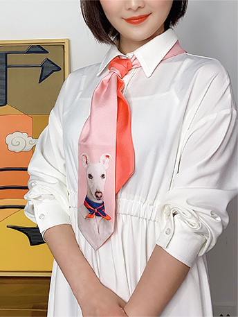 作品將格力犬卡通化擬人化,配以百分百蠶絲材質制作成窄巾,一面印花一面純色,簡潔百搭,而且男女通用。
